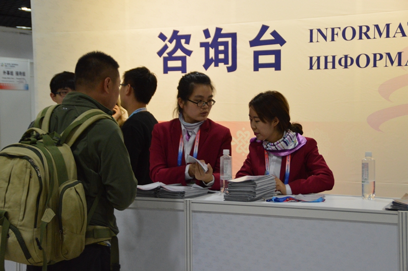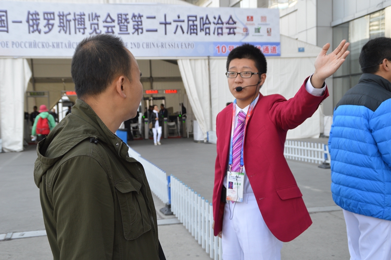在展会期间,志愿者们遇到了各种各样的问题和困难,每天都会遇到新的考验和突发情况,比如丢失证件和财物、会场内外迷路、急需组委会帮助协调问题等等,但志愿者们用耐心克服了困难,用爱心化解了问题,在大家的共同努力下,各项服务工作得以圆满完成。本次展会,我校共有48人负责室外咨询和人流疏导,主要在会场外开展咨询和引导服务,他们克服了阴雨天气和寒冷造成的不便与困难,尽心尽力地为来宾服务,来自外国语学院的志愿者全宝玉回忆自己的工作场景是这样的,“‘您好,请问有什么能帮您吗?’‘您好,持票的参观者直走左转在长江路2号门进入 。’这些是我说过最多的话,不断重复,不断提高音量,但并没有使我感到烦躁,收到的那句发自内心的‘谢谢’使我感到无比的快乐。”负责室内咨询的志愿者徐今帝是一名大四学生,今年是她第二次参加中俄博览会,10月10日上午,她和小伙伴刚值完班,遇见一位表情焦急的俄罗斯参展商,可是由于语言不通,周围人都不知道他到底怎么了,徐今帝在与他交流后得知他现在身体不适,了解情况后徐今帝和其他志愿者及时把他带到了医务室得到了及时治疗。这样的例子还有很多,志愿者们展现出的热情和友善,以及耐心和爱心使他们成为展会上最亮丽的风景。