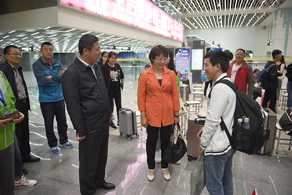 党委副书记陈文慧在哈尔滨西站与新生交谈