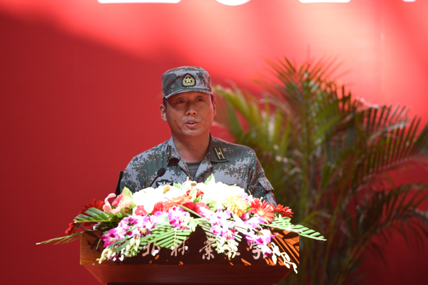 园林学院2017级张尧同学代表新生对军训生活做出承诺:提高国防意识,勇担青年重任;严格遵守纪律,一切行动听指挥;培养军人品质,巩固军训成果。(文:郭楠枫/图:王乙)