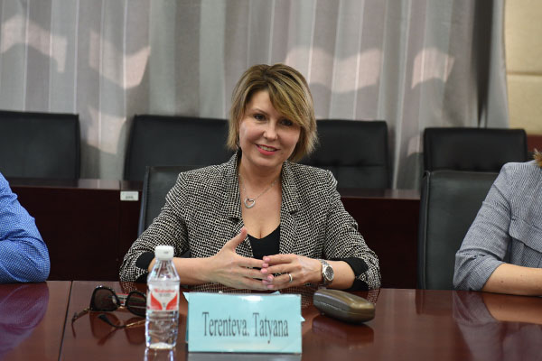 Terenteva. Tatyana校长对我校的热情接待表示感谢,她介绍说,符大是一所致力于经济和服务行业的学校,拥有三所幼儿园,以及小学、中学、中专、大学,位居俄罗斯教育部评比的前100所高校之列,目前有四百多名留学生,其中大部分来自中国。Terenteva. Tatyana校长表示对这次交流充满期待,希望在本科教育与科研合作方面有新的突破。