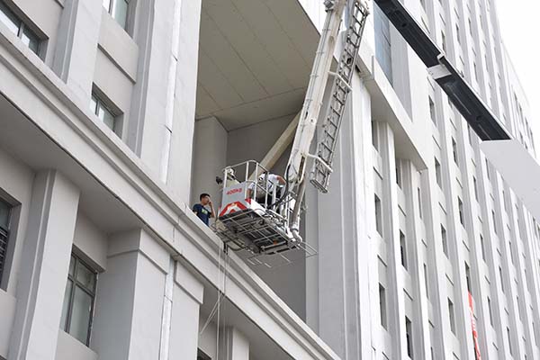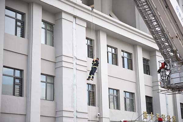 香坊消防大队动力中队官兵接到报警后及时赶到现场,迅速实施灭火救援,冲天的水柱喷洒在宿舍楼的起火处,火势得以控制,消防战士架起云梯成功救出被困于3楼的2名学生,并演示了如何正确使用缓降绳逃生。
