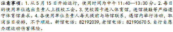 学校决定,从本月15日起,新、老体育馆今起部分时间向教职工免费开放。具体安排是:每周一至周五中午11:40—13:30(老馆),每周一和周四中午11:40—13:30(新馆)篮球、排球、羽毛球场地,向我校工会会员免费开放。