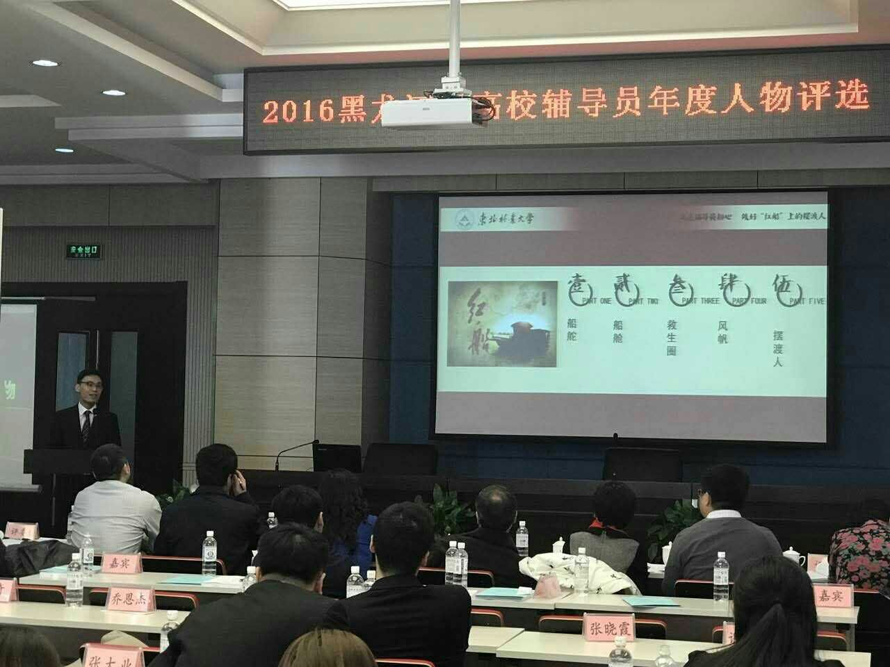 本次评选由中共黑龙江省委高校工委宣传部、黑龙江省教育厅思政处指导,教育部高校辅导员培训和研修基地(哈尔滨师范大学)、黑龙江省高等教育学会学生工作专业委员会主办,评选改变了以往单纯材料评审的方式,采取了材料初评(占40%)+集中述职评审(占60%)的方式,乔恩杰在述职评审中表现优异,获得第四名,并将被推荐参评第九届全国高校辅导员年度人物评选。近年来,我校先后已有8名辅导员获评全国、黑龙江省辅导员年度人物。(侯利军)