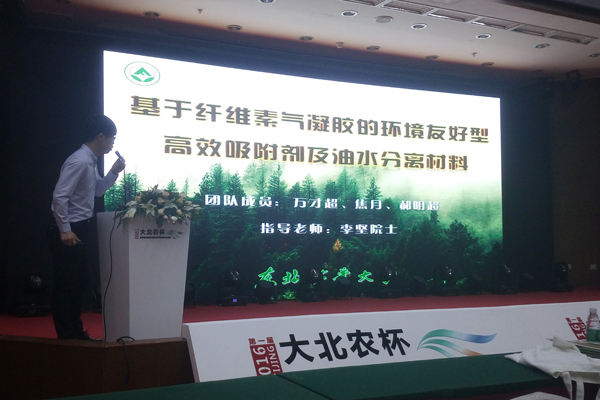 我校高度重视本次比赛,在校内经过层层选拔,精心推荐作品参赛,并对决赛作品统一指导优化。万才超等同学的作品在李坚院士的指导下,主要是以农林生物质资源为原材料,制备纤维素气凝胶,并通过理化改性、掺杂、热解等手段,构建新型的气凝胶吸附材料,以处理含油废水、染料废水、重金属离子废水等污染性水体。作品的前瞻性和严谨性得到了组委会专家的一致好评。