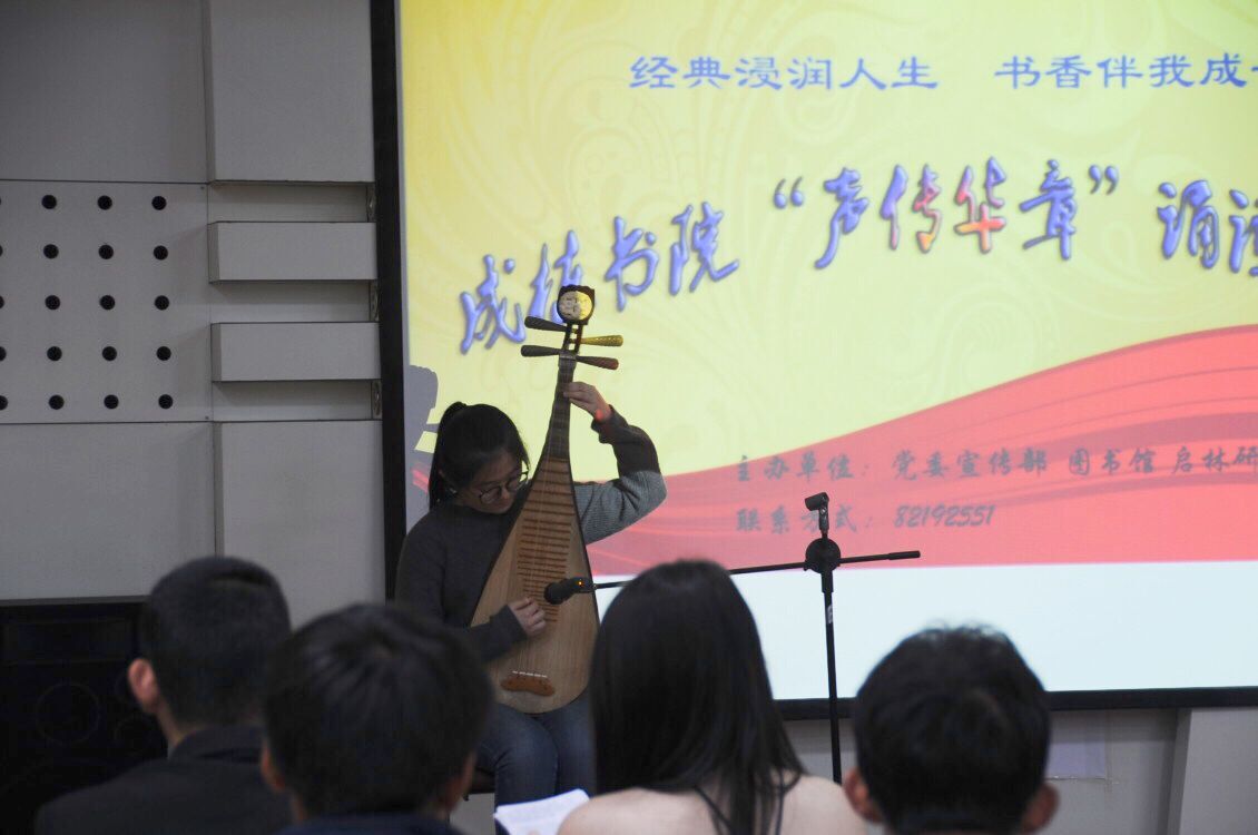 11月26日晚,成栋书院“声传华章”诵读活动在图书馆多功能厅成功举办。此次活动由校党委宣传部、图书馆、启林研究会和校广播台联合举办,旨在丰富校园文化生活,倡导学生用健康高雅的文化艺术陶冶情操。来自我校启林研究会和校广播台的十三名同学为观众们朗诵了9篇中外经典诗篇。朗诵过程中还穿插了琵琶和小提琴独奏,整个活动过程萦绕着高雅的艺术氛围。