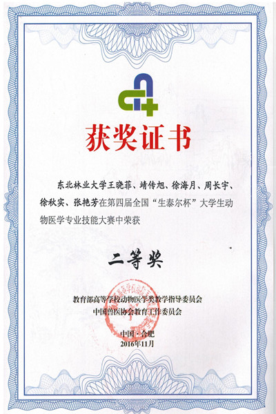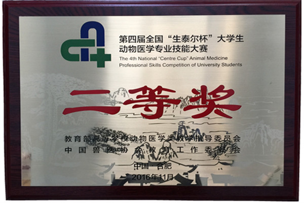 2016年11月3日至4日,第四届全国“生泰尔杯”大学生动物医学专业技能大赛在安徽合肥隆重举行。经过历时两天三场的激烈角逐,我校野生动物资源学院代表队荣获大赛二等奖,这也是我校动物医学专业学生首次参加国家级比赛并获得殊荣。