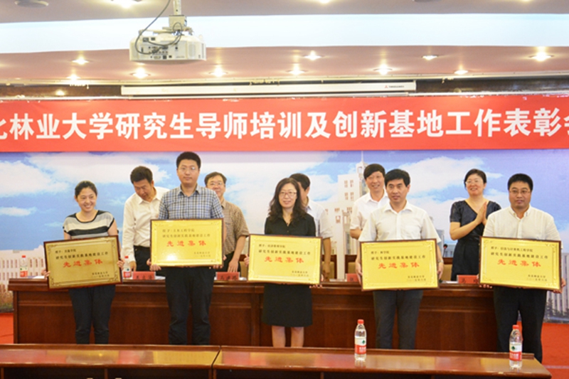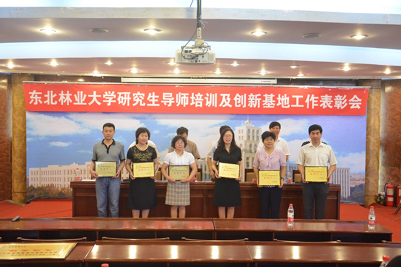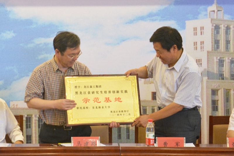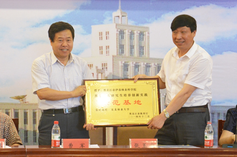 副校长曹军为我校在龙江森工集团和伊春林业科学院的两个省级示范基地授牌。主席台就坐的领导为学校基地工作先进集体及先进个人颁奖。