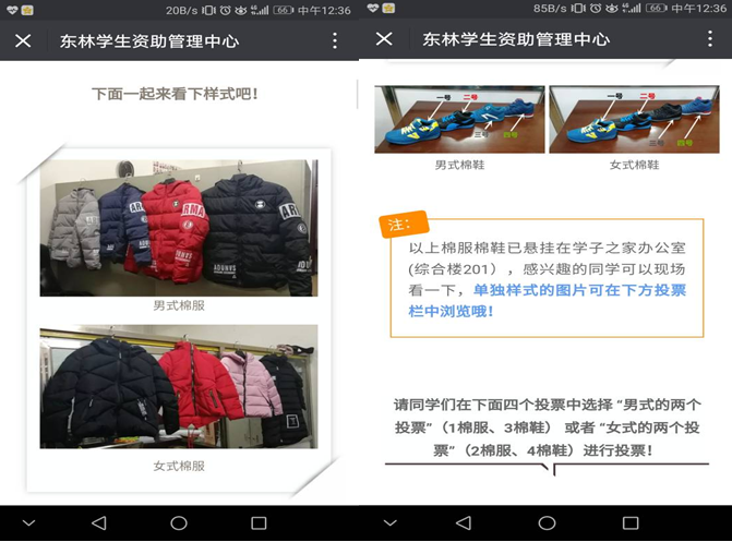 今年的越冬棉衣物发放工作,在去年自选环节纳入线上操作的基础上,采用“线上线下”同时进行,学生既可以通过手机也可以到现场,像在网上购物和超市购物一样选择自己喜欢的款式、颜色和尺码,学校对他们的要求做好登记和汇总,再通知供货商按要求提供;同时,发放的时间较之以往提前了一周,在哈尔滨的寒冬来临之前,提前将温暖送到同学们手中,同时延长发放时间,从10月30日至11月6日,每天的8点30分—21点30分,同学们可以根据自己的课余时间,随时取到冬衣、棉鞋。