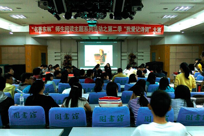 5月21日晚,第二季“我爱记诗词”大赛决赛在图书馆多功能厅举办。这次活动是我校“书香东林”师生阅读系列活动之一。比赛从初赛到决赛历时近一月,来自我校不同院系的25名选手经过初赛的角逐获得了参加决赛的资格,并经过抽签组成五个组别,成为决赛的竞争对手。比赛时选手们的亲友团前来助战,选手及观众近百人齐集图书馆多功能厅。马克思主义学院院长刘经伟、文法学院教授胡玉娟、图书馆业务推广部主任赵一霖、材料科学与工程学院青年教师牛晓霆、文法学院学生刘林担任决赛评委。党委宣传统战部宋东国部长,图书馆邹红菲馆长、李学益书记、张静副馆长以及党委宣传部李洪峰副部长应邀作为嘉宾观看了比赛。