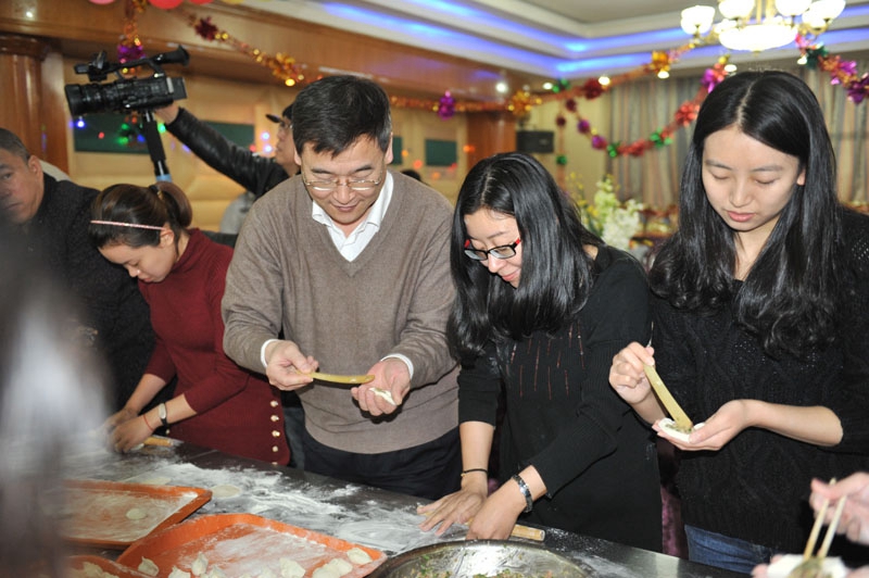 “呀,师兄你还会包花边饺子呐。”“你这饺子形状怎么这么奇怪?”“负责包硬币的不许作弊啊!”……在一片欢声笑语中,留校学生与学校领导、后勤服务总公司的领导、各学院党委副书记、辅导员们一起热热闹闹地包完了饺子。