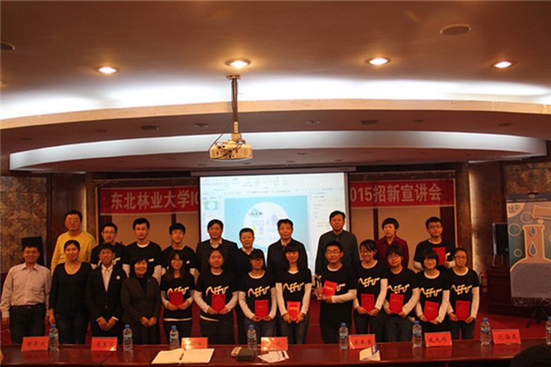 11月26日下午,东北林业大学IGEM(国际遗传工程机器设计大赛)2014总结报告会暨2015招新宣讲会在动资楼331会议室成功召开。副校长李斌、教务处处长翟雪峰、科学技术研究院党总支书记李春英、生命科学学院院长李玉花、理学院院长戚大伟、林学院副院长沈海龙等出席会议并为获奖学生颁奖。国际合作处相关人员、生命科学学院部分师生以及对大赛感兴趣的其他学院学生也参加了报告会。