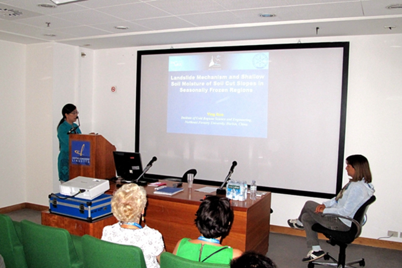 9月16日,本次大会“气候变化背景下寒冷地区环境地质与工程地质问题”分组会议召开。我校单炜教授作为本分组会议第一召集人首先发言,并作题为“Environmental and Engineering Geology of the Bei’an to Heihe Expressway in China with a Focus on Climate Change”(“气候变化背景下北安到黑河高速公路建设的环境和地质问题”)的学术报告;我校郭颖博士作为青年召集人主持了会议,并作题为“Landslide Mechanism and Shallow Soil Moisture of Soil Cut Slopes in Seasonally Frozen Regions”(“季节冻土地区土质路堑边坡浅层含水量变化及滑坡机理”)的学术报告;我校胡照广、姜华、王春娇的研究成果在本次会议上作了海报展示。经大会学术委员会抽取专家通讯评审,本专题共遴选来自奥地利、中国、加拿大、德国、法国、日本、意大利、俄罗斯、瑞士等国家有关学者学术论文22篇,其中我校提交5篇论文全部录用。