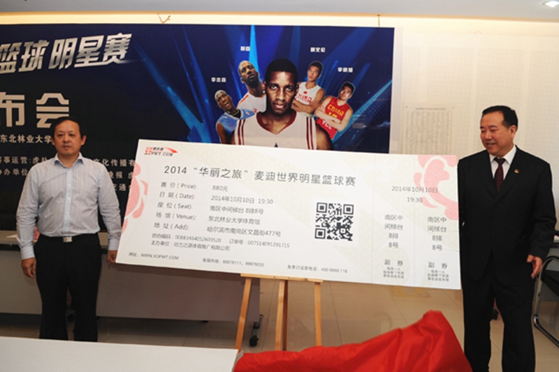 李峰副局长与李顺龙副校长共同为2014“华丽之旅”世界篮球明星赛(哈尔滨站)开票。