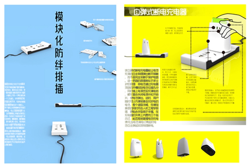 2014“市长杯”大连工业设计大赛获奖名单近日揭晓,我校机电工程学院工业设计专业龚潇潇同学的设计作品喜获创意组三等奖。龚潇潇同学设计的“模块化防绊排插”和“自弹式断电充电器”是一套人性化组合充电产品,意在探索人们在充电活动中更方便更安全的使用方式。