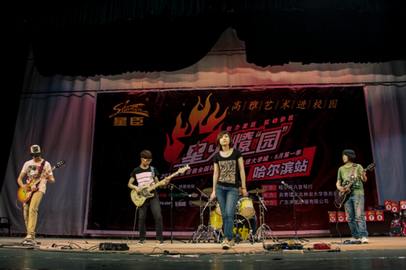 异族摇滚学生社团乐队激情四射的演唱拉开了本次独奏会的帷幕。首先上台为大家演奏的是著名古典吉他演奏家赵长贵老师,在简单的介绍了古典吉他的历史演变以及与民谣吉他等的区别后,赵老师先后弹奏了经典吉他曲《爱的罗曼斯》以及关于吉普赛民族的几首吉他乐曲,他用娴熟的弹奏技巧将乐曲中的意境淋漓尽致的展现出来,让现场观众如临其境。