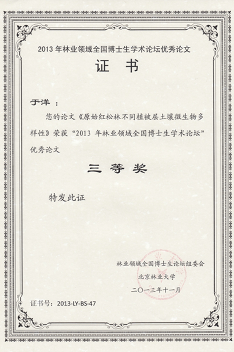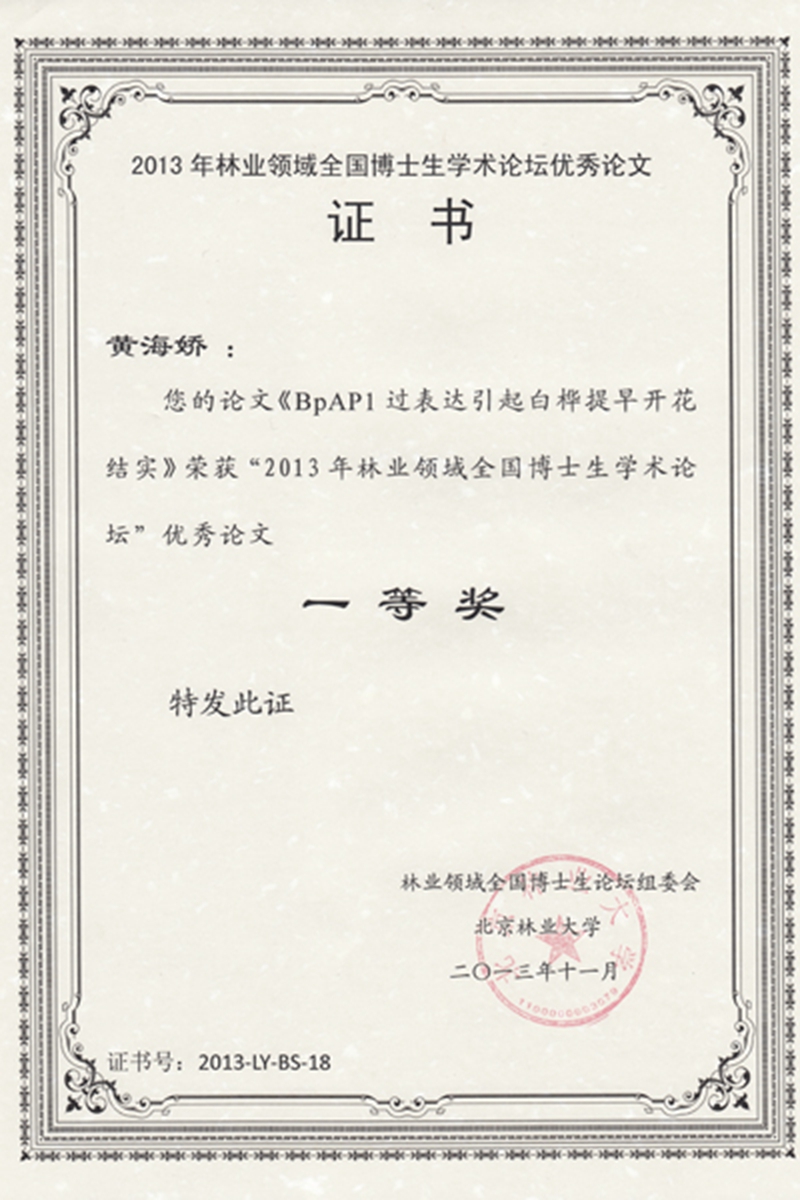 由教育部学位管理与研究生教育司主办,北京林业大学承办的“2013年林业领域全国博士生学术论坛”于11月28—29日在北京林业大学召开,国务院学位办相关部门。30名院士、教授和专家,169名来自中国科学院、中国林科院、西北农林科技大学等24个高校及科研院所的研究生参加了本次论坛。在学校的精心组织下,指导教师和研究生的积极参与下,我校共有30名博士和高年级优秀硕士研究生参加,在24个参与院校和科研单位中,研究生总数和获奖总数仅次于承办方。其中11名博士研究生在大会上做了学术交流报告,黄海娇博士获论坛优秀论文一等奖,于洋、马承慧、王留强、孙彩玉、赵博、董灵波6名博士获优秀论文三等奖。