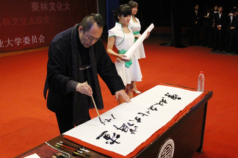 随后,张老师将更多的时间留与同学们互动交流,幽默风趣地回答同学们在网络平台及现场提出的各种问题。针对同学尖锐提出的“如何看待月考问题”,张老师结合自身中西方教育经历,阐述了中国高等教育的发展方向,认为大学学习是冲刺人生的重要一步,考试是必要和必须的,鼓励大家经受住“月考的重重考验”,取得学业的“大丰收”,博得了满堂掌声;他用“我们仨的追求不一样啦,王刚热衷收藏,忙于铁锤砸宝,张国立是工作狂,让他每天工作就开心了,我们也都老了,很难再合作了”来回应“‘乾隆帝’是否还有想法和‘和珅’、‘纪晓岚’再一次合作的问题”;当观众向他抛出“在学业与梦想之间何去何从”的问题时,他更是从一位慈父的角度鼓励大家:“专业并不能决定你的未来,你的任何决定都不要以伤害父母的心为代价,学林业的学生可以去画画,学医学的同样可以当警察”;谈及拍戏的趣闻与扮演皇帝的心得时,张老师表示演皇帝最容易,“越不说话越威严,越有帝王范”,并诙谐地将自己定位为“养尊处优,儿女情长,管理后宫琐事”的皇帝,张老师也自我调侃到,“出演皇上并不像你们看到的那样光鲜亮丽,可能在导演喊卡的下一秒就沦为盒饭都抢不到的‘可怜皇帝’”。讲座最后,张铁林先生挥毫泼墨为“东林文化大讲堂”题字留念。