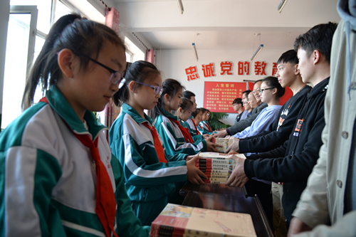 森林工程系教工党员和学生党员将书籍送到小学生手中