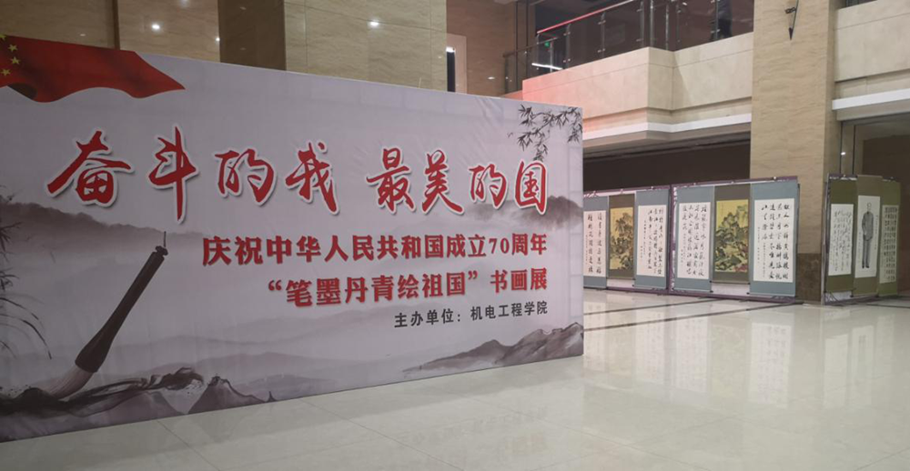 9月24日,距离祖国七十华诞一周,机电工程学院“奋斗的我 最美的国”笔墨丹青绘祖国主题书画展在成栋楼方厅揭幕,由此也拉开了学院“庆华诞”系列活动的帷幕。本次书画展为期半个月,分两个阶段展出师生软笔书法、硬笔书法、国画等作品百余件。笔画勾勒里饱含着师生对伟大祖国的真挚热爱,浓墨淡彩间满溢着师生对伟大祖国的深情诉说。