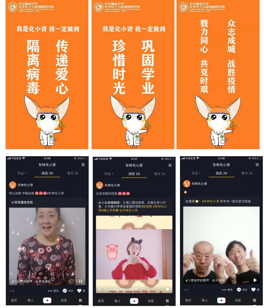 疫情防控期间,化资学院团委、大学生网络发展中心依托“东林化资党团”微信公众平台宣传防疫健康知识、讲述抗疫故事、传递必胜信念。“我是化小资,我一定做到!”学院暖心的橙色抗疫主题海报向同学们发出“戮力同心、众志成城、共克时艰、战胜疫情”的号召。同时,学院通过抖音APP推出“众志成城抗疫情,健康充实度假期”短视频打卡活动。学院党委副书记祝胜男和辅导员老师与同学们一起参与短视频拍摄,记录科学的“宅”家时光,为抗击疫情贡献一份特殊的力量。学院团委联合林学院团委开展“晚安计划”,以短信的形式为湖北籍学生送上祝福和鼓励。近期,学院团委结合网络教学的实际情况,开展网课学习笔记线上评比展示活动。2019级化学类1班石扬天同学表示,通过参与学院线上活动,同学们增强了在家学习的动力和热情,丰富了日常学习生活,期待疫情结束与老师、同学们在东林相聚。