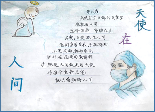宋佳同志担任学院的教学秘书,面对突发的疫情,学校将线下课程调整为线上授课。为了确保每位老师都能保质保量完成线上授课,每一名学生都能完成线上学习,她从二月中旬就开始投入工作,细致全面地统计学院每门课程授课情况。她创作的是一张感恩卡,想表达的含义是:在这场只许胜利的战役中,哪里有疫情、险情,哪里最困难、最艰苦,哪里就有“白衣天使”的身影。他们舍生忘死、默默坚守最前线,用实际行动践行“守初心、担使命、战疫情、保平安”的神圣职责!他们就是最美的天使,将每个生命点亮,把大爱洒满人间。