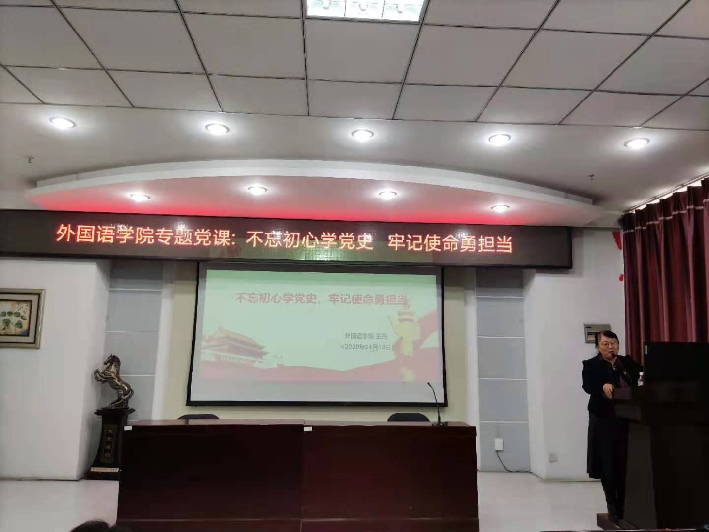 11月18日,外国语学院于文博楼1019开展了“不忘初心学党史、牢记使命勇担当”专题党课学习活动,由外国语学院党委书记王丹主讲。参加党课的有全体教工党员及学生党员代表,共百余人。