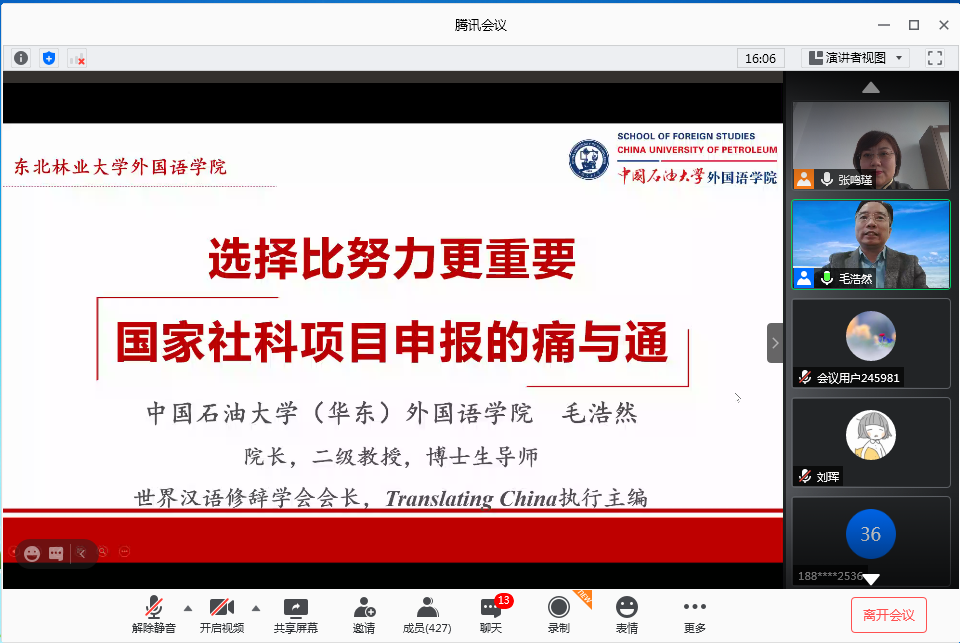 为进一步提高外国语学院国家社科基金项目的申报质量和立项率,切实推进学院的国家社科基金项目申报工作,11月23日14:00-16:00,外国语学院以腾讯会议形式举办了东林外语文博讲坛之国家社科基金项目申报专题讲座。本次讲座邀请中国石油大学(华东)外国语学院院长,二级教授,博士生导师毛浩然教授为主讲人,外国语学院副院长张鸣瑾主持本次讲座,外国语学院全体教师、研究生及国内高校的科研工作者近600人聆听了此次讲座。
