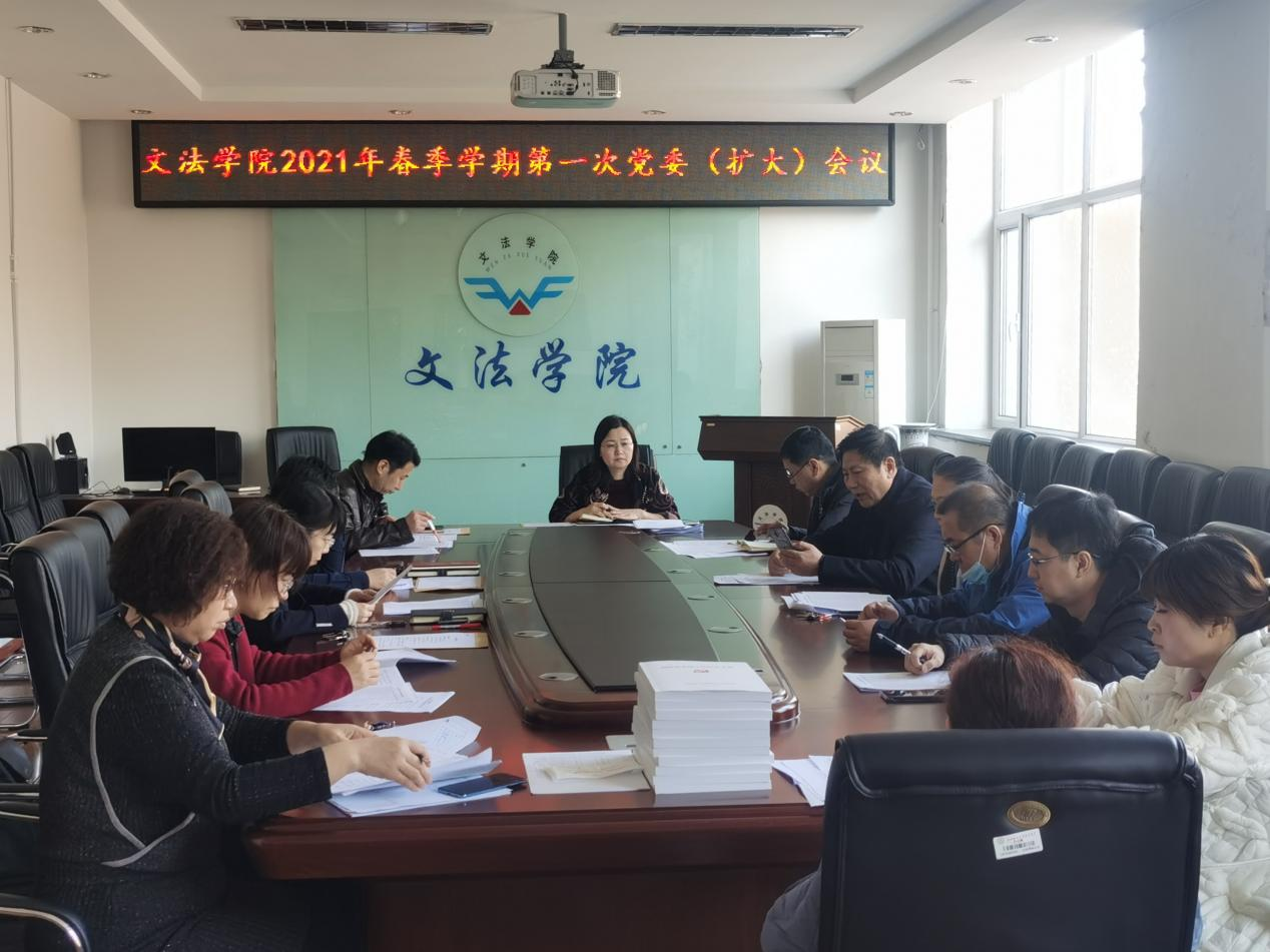 3月24日上午,文法学院党委在学院二楼会议室召开2021年第一次党委(扩大)会,学院党委委员、纪委委员、学院师德师风建设领导小组暨年度考核工作领导小组全体成员参加会议,会议由学院党委书记李玉荣主持。