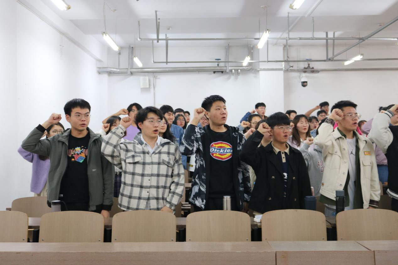 学生第一党支部55名发展对象,在党支部书记赵高佳的带领下,面向党旗庄严宣誓,并一同戴好党徽,亮出党员身份,不忘入党初心。