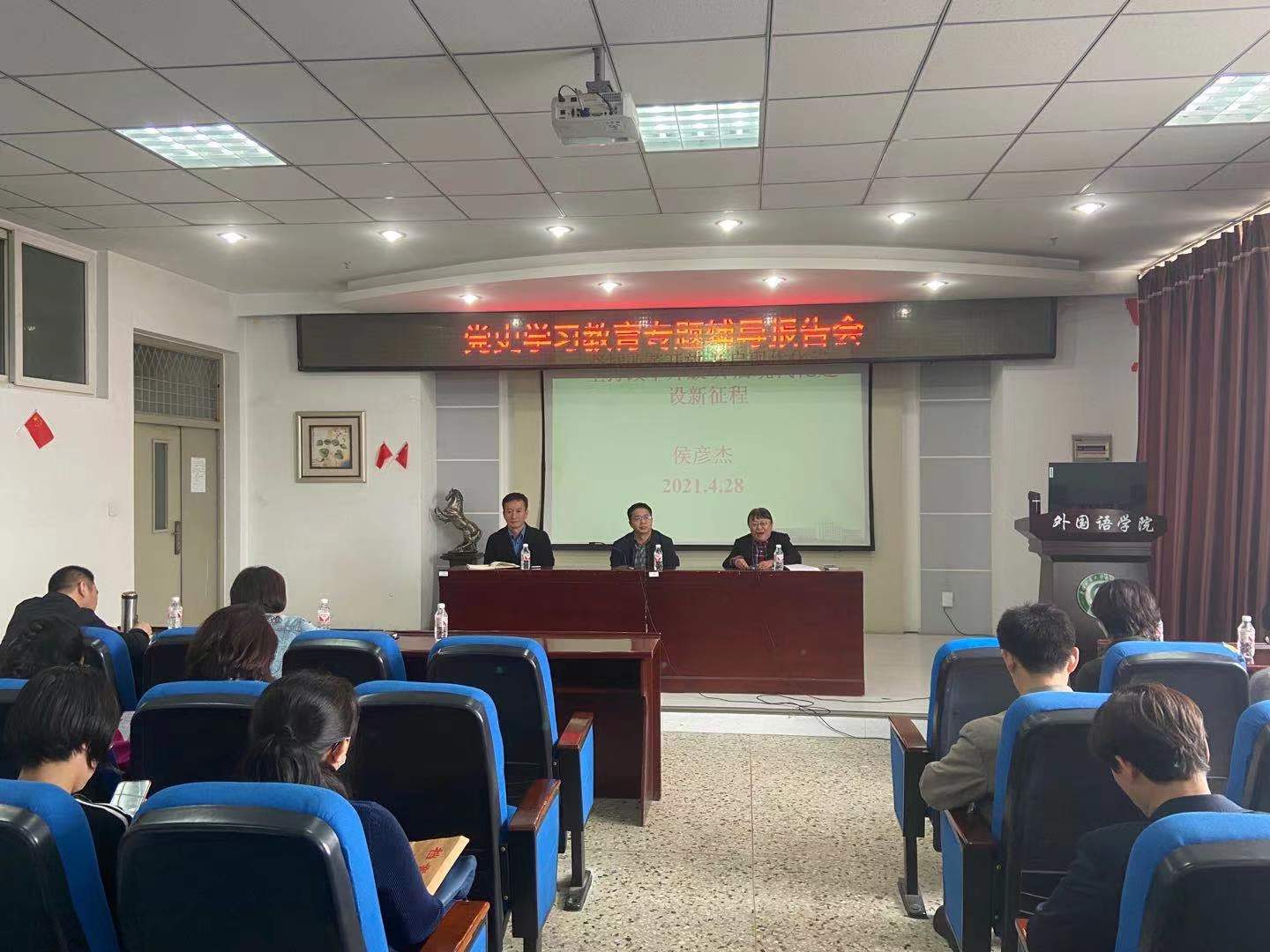 4月28日下午,外国语学院与继续教育学院在学校文博楼1019室联合开展教职工党史学习教育活动,邀请马克思主义学院院长侯彦杰教授作了党史学习教育专题辅导。两个学院的领导班子成员以及单位教职工等一百余人参加集中学习,外国语学院党委书记王丹教授主持报告会。