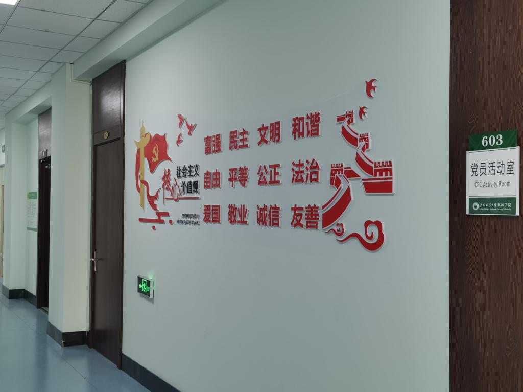此外,学院党委也在六楼办公区营造了党建文化氛围,将辅导员办公室、学院党建室和楼道长廊打造成党建文化宣传阵地,为实现学院党建的常态化提供了新平台。党建文化氛围营造包含入党誓词、辅导员誓词、党支部组织构架、社会主义核心价值观等专题板块,既积极宣传党组织工作制度,也涵盖了当前党建工作的重点内容,让学生既受教育又耳目一新,有效增强了党史学习的直观性和教育性。为积极落实学院党史学习教育“读好一本书”活动,推动“党史”学习教育学得真,学得实,学院党建室还购进100本党史相关书籍(党史学习“百书”书目),供广大师生选择阅读,使全体党员理论学习有收获,思想政治受洗礼。