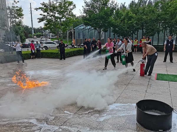 在消防安全知识培训结束后,保卫处处长李长松、副处长孙文震、 副处长佟庆志共同组织博物馆全体工作人员进行消防安全演练。消防安全演练主要围绕火灾逃生疏散、应急抢险火灾扑救、消防器材使用等几个方面来开展。实战演练环节,博物馆所有工作人员都参与到模拟火灾现场,学习掌握正确使用灭火器的方法。