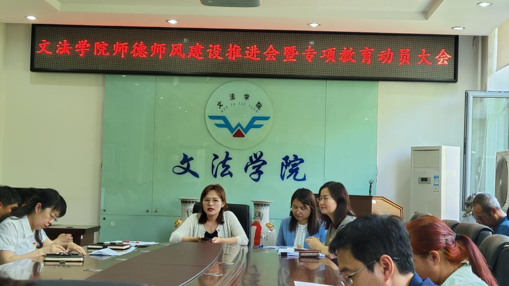 6月23日下午,文法学院召开师德师风建设推进会暨专项教育动员大会,学院领导班子与全院教职工参加会议,文法学院党委书记李玉荣主持会议。
