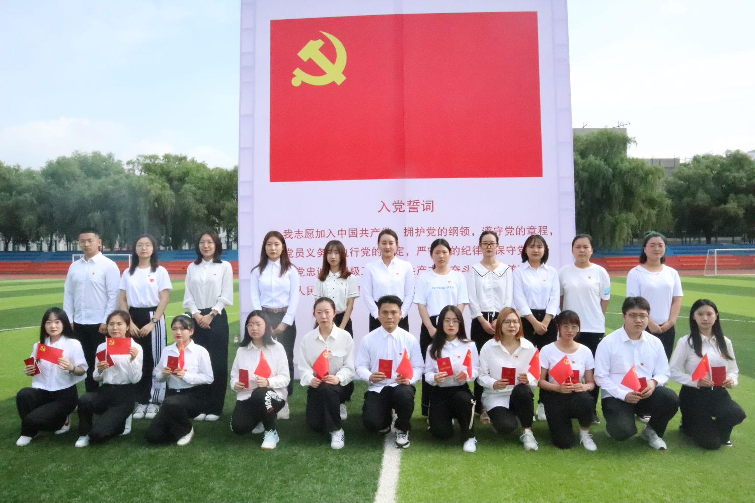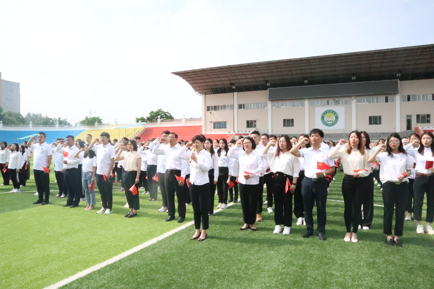 田径场上响起铿锵有力的宣誓声,在张艳波副书记的带领下,500多名新老党员,整齐列队,佩戴党徽,举起右拳,面向党旗,庄严宣誓。铮铮誓言,字字铿锵,表达了每一名新党员对党的忠心和为共产主义事业奋斗终生的决心。学院党委书记王维宏在讲话中勉励新党员要永远牢记入党誓言,坚定理想信念,践行党的宗旨,担当时代重任,要更好地传承红色基因,发扬光荣传统,发挥党员的模范带头作用。随后,老党员向新党员赠送党徽、党章、党旗,表达了对后辈的激励、传承,更是是奋斗精神的延续!学生第八党支部预备党员代表张奚璇发言,表示将以此次宣誓为契机,始终牢记党员先行、人民至上,发挥党员先锋模范作用,努力做好新百年的新党员。