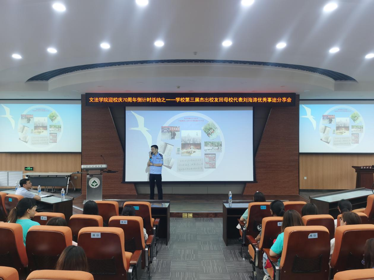 7月9日上午,文法学院迎校庆70周年倒计时活动之——学校第三届杰出校友回母校代表刘海涛、吴小华优秀事迹分享会于奥林学院101会议室举行,文法学院党委书记李玉荣、党委副书记王晓光以及各年级160余名学生参加了本次分享会。