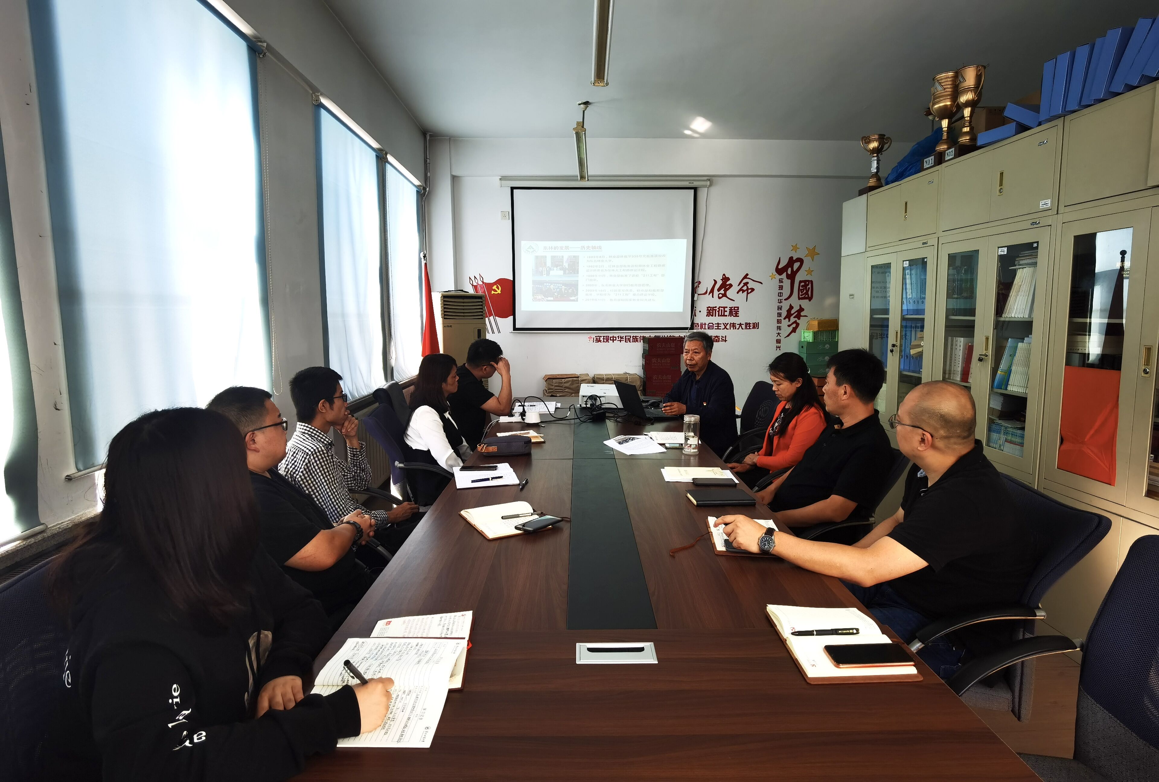 杨滨章指出,学校取得今天的辉煌成就,离不开老一辈东林人的辛勤耕耘与奉献。传奇校长刘成栋以发展国家教育事业为理想;李坚院士为让东林划归教育部带病进京为学校争取机会;我国植物分类学家刘慎谔等林业领域杰出学者坚守理想不忘初心的故事让在场的党员们既震撼又感动。