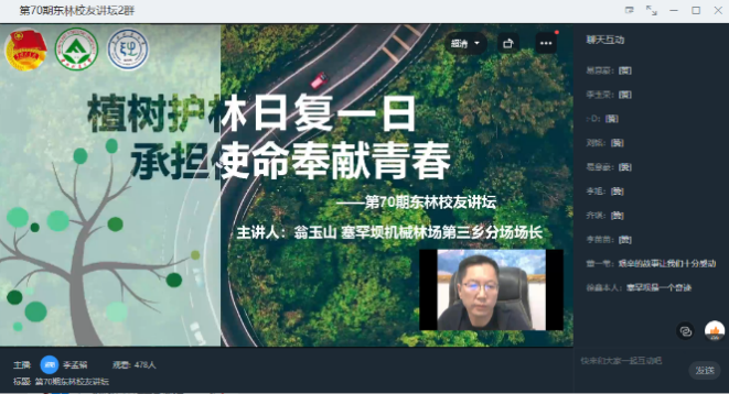论坛开始后,翁玉山校友向大家分享了2021年8月23日习近平总书记考察塞罕坝机械林场时的情景,线上聆听的师生们纷纷以点赞、留言等方式表达内心的敬佩之情和作为东林人的骄傲。