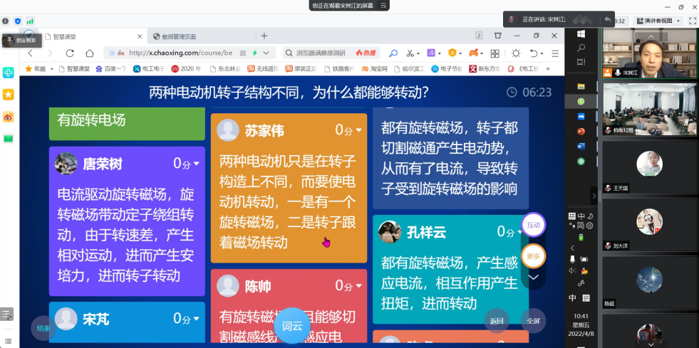 为进一步落实立德树人根本任务,提升青年教师课堂教学能力和专业水平,全面搭建青年教师成长平台,充分发挥优秀教师引领、示范和辐射作用,推动教学水平高质量发展,4月8日,机电工程学院启动中青年教师立德树人能力提升计划暨集体教学观摩活动,邀请电工学教研室主任、黑龙江省一流本科课程负责人宋其江,以线上授课方式进行了一场“电工电子学A”教学公开观摩课。学校教学研究与质量监控中心主任张佳薇,学校教学督导,学院领导,教学督导、全体中青年教师等一百多人参加。