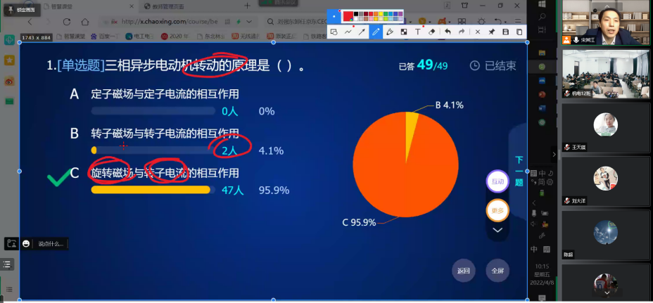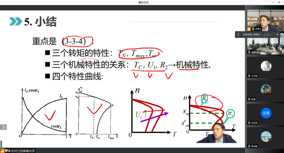本次课程采用“腾讯会议+学习通”的形式进行在线直播,内容是《三相异步电动机的概述》。宋其江老师通过学习通教学平台发布测验,了解学生对前期知识的掌握程度,更好地实现知识的强化矫正。以启发式教学方式引出主要教学内容,深入浅出构建知识体系,加强学生对课程内容的认识和理解。通过生活实例、动画等更为直观易懂的教学手段对重难点知识深入讲解,并巧妙地将思政元素融入专业课堂,充分调动学生积极性。发布课堂练习,以练代讲,直播投屏批改练习,开展师生研讨与教师讲评,引导学生独立思考,促进知识内化,有效提高了学生的参与度,检验了学习成效。最后,宋老师以思维导图形式进行课程小结,总结方法,整合反思,并布置课后作业,加强巩固,拓展知识。整节课实现了课前测验-课程导入-强化目标-参与式活动-课堂小结-课后作业-布置任务的教学闭环,多元化的教学手段和形式、线上线下相融合的教学方法,理论知识与仿真实验的结合,将学生吸引在课堂,提升了教学效果,培养了学生的自学能力和独立思考的能力。