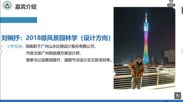 刘婉抒校友,目前在广州山水比德景观设计有限公司从事设计工作,与大家分享了毕业后一年的工作感受并分享了如何更好地选择实习岗位以及选择实习城市的技巧,并根据自身的工作经验介绍如何选择适合自身发展的实习单位,指出实习是能够为简历加分的重要因素,要多方面考量实习单位,敢于展现自己的专业优势,尽早的为今后的就业做准备。