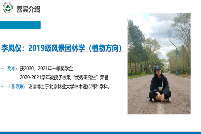 2019级风景园林学植物硕士李凤仪从博士的申请与准备进行了介绍。她从本校读博与外校读博的申请考核方式、院校选择、申请材料、报考时的心理建设等方面为同学们做了全面的经验分享。最后,她建议同学要加强对英语的重要,鼓励大家掌握专业英语。