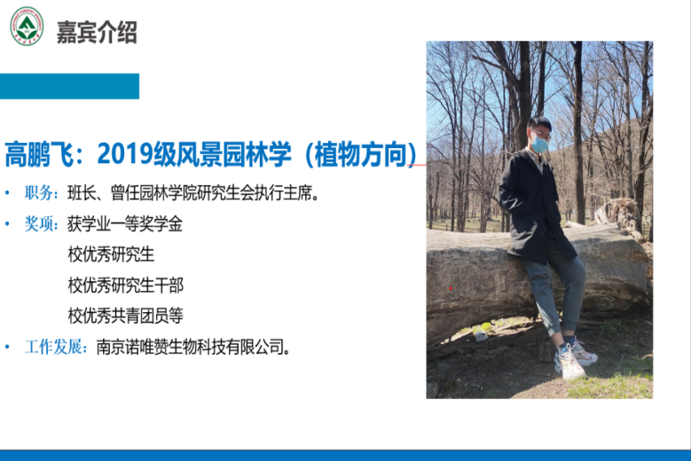 2019级风景园林学植物硕士高鹏飞分别从求职入门、老“生”常谈、求职自信三个方面进行了分享。针对求职信息,他谈到了常用的求职网站、公众号,为同学们提供了优质的就业渠道。在简历的制作时,他建议同学们针对不同类型的企业,简历制作时要有不同的要点与侧重点,强调了个人实践经历的重要性。针对面试的问题以及测评,他结合自身实际提出了可实际操作的建议。