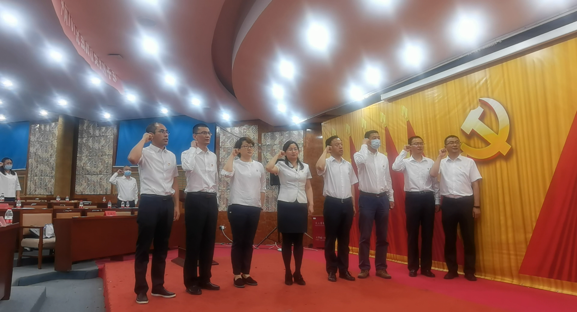 会议伊始,理学院党委第四届委员会委员与学院全体师生党员在李玉荣的带领下,庄严面向党旗,预备党员进行入党宣誓,正式党员重温誓词。