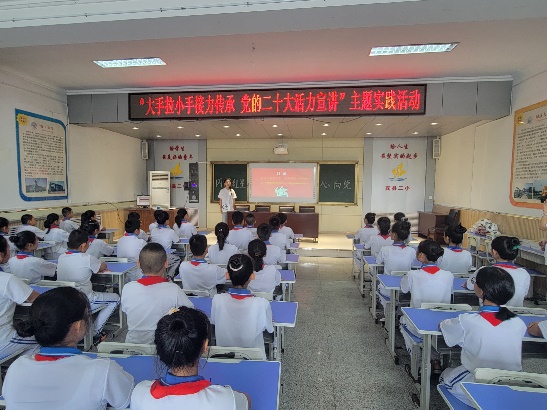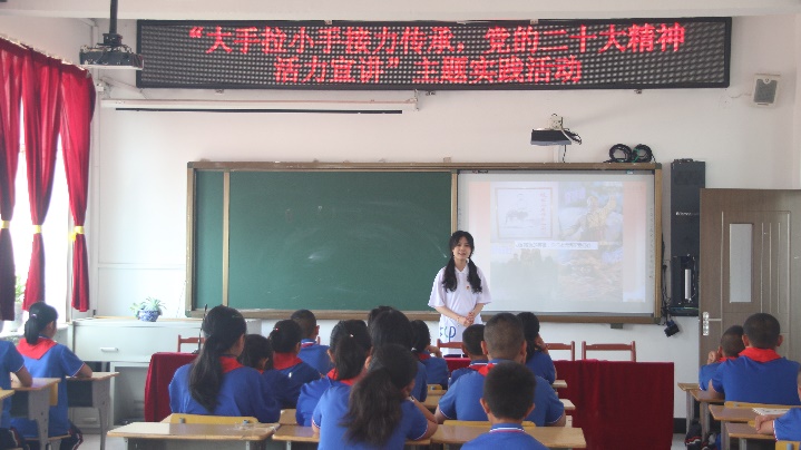 调研中,实践团队针对性地开展了“大手拉小手接力传承,党的二十大精神活力宣讲”主题公开课,从“红船、长征、解放、建设”四个关键词出发,结合党的二十大精神,回顾来时道路,展望未来篇章,在留守儿童心中深埋红色火种。