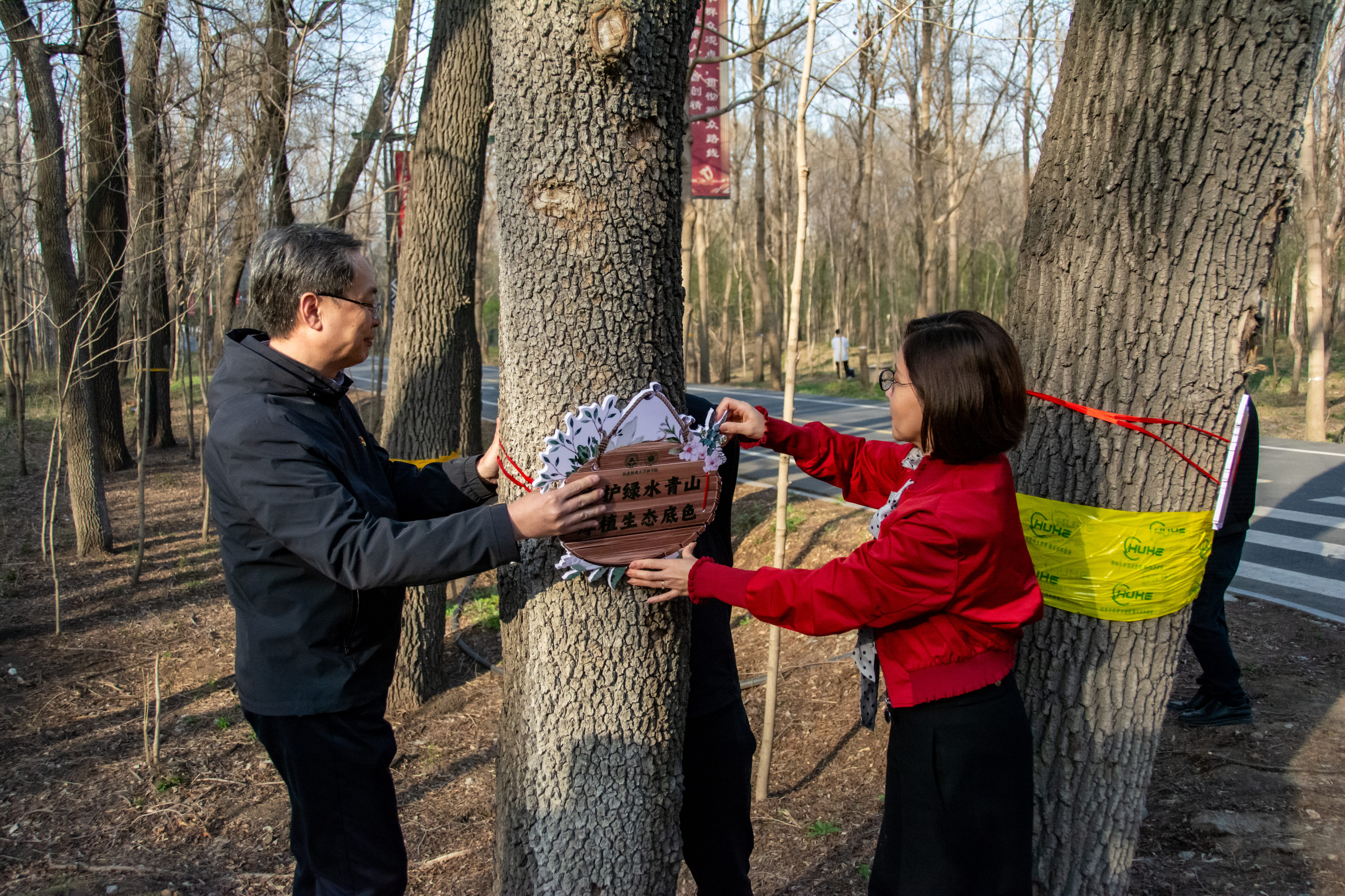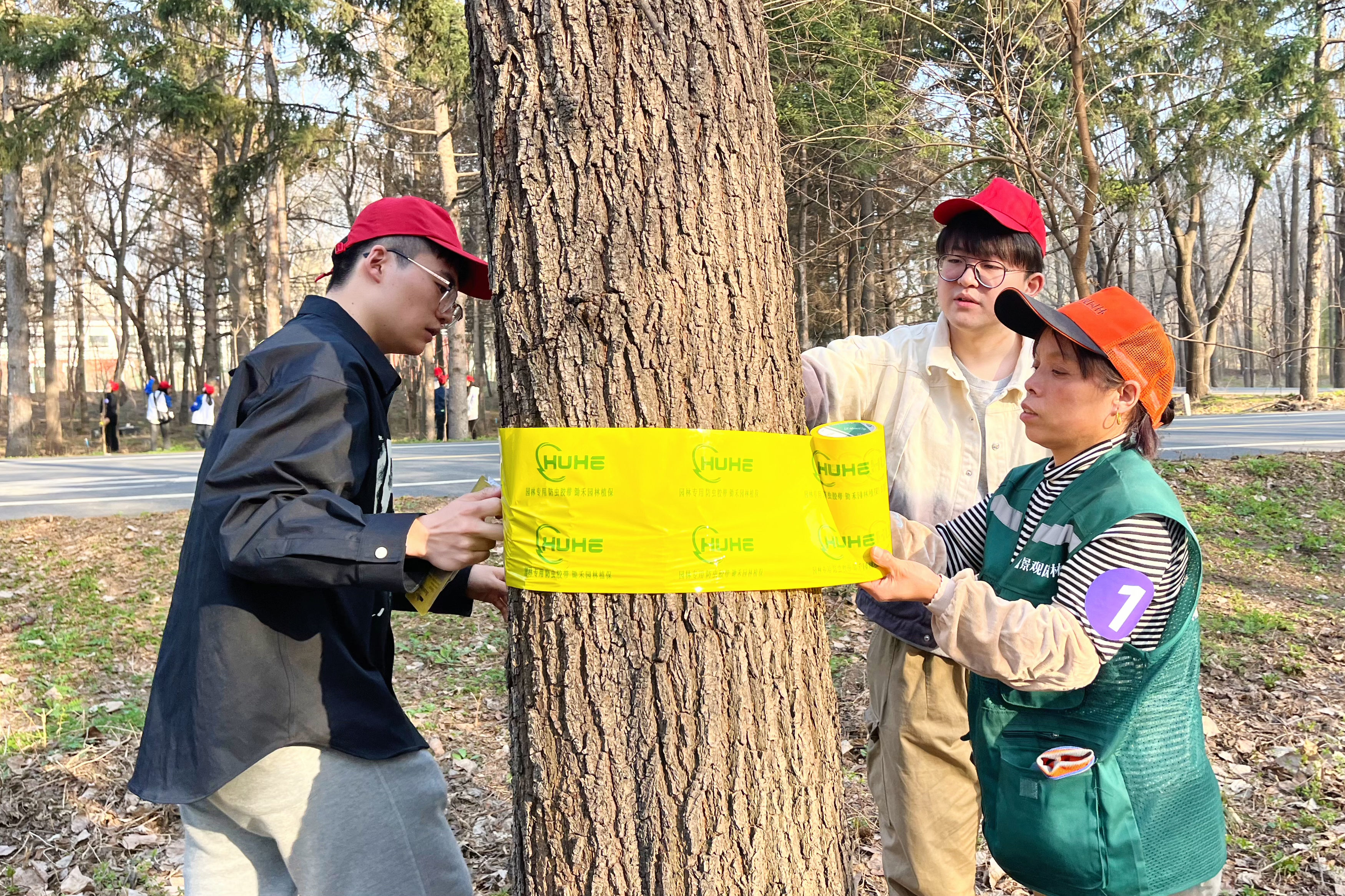 森林植物资源学科王秀伟教授向在场师生科普了相关树种知识,带领师生观察并讲解了桑树和榆树的区别,从理论层面为在场师生上了一节生动的生态知识课。森林保护学学科姜礅教授详细讲解了树木病虫的生活习性,除虫知识和相关技巧。校园建设处负责老师、林场工人现场进行示范操作。