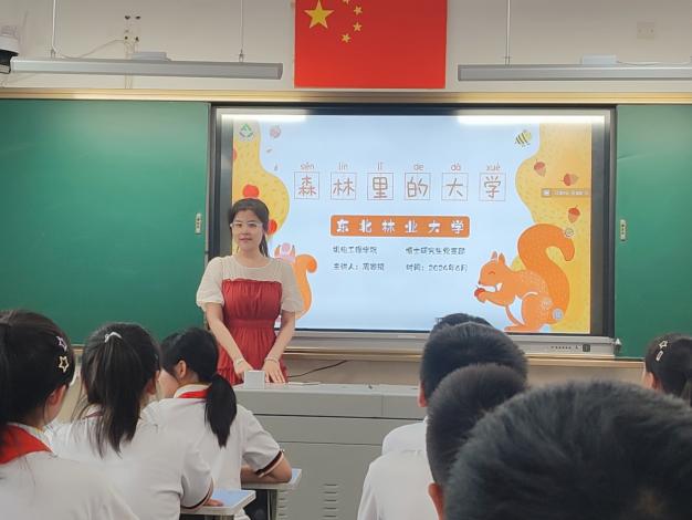 “东北林业大学的面积有多大?”“森林博物馆里有什么?”近日,机电工程学院党委选派博士生党员代表,走进齐齐哈尔市泰来县实验小学和泰来镇中心学校,开展生态文明实践,与这里的学生共上大思政课。课堂上展示着东林优美校园景色的图片,小学生们一边积极思考,一边踊跃举手作答,现场氛围异常活跃。