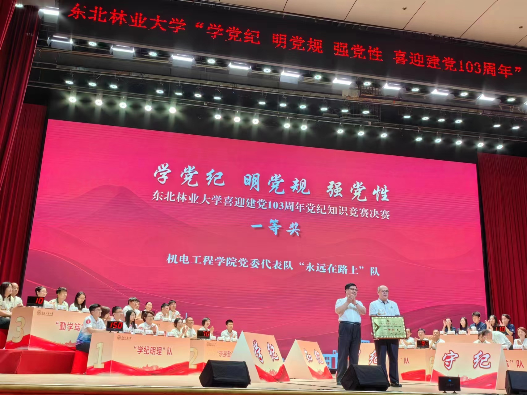 在学校下发举办党纪知识竞赛通知后,学院党委书记、副院长带队,遴选专业主任、教工党支部书记、组织员、师生党员组建了“永远在路上”“山清水秀”两支队伍参加竞赛。经过笔试环节,“永远在路上”队代表学院晋级决赛。决赛中,机电人团结协作、配合默契,发挥优势、敢打敢拼,展现出扎实的知识储备和昂扬的精神风貌,最终获得一等奖的好成绩。