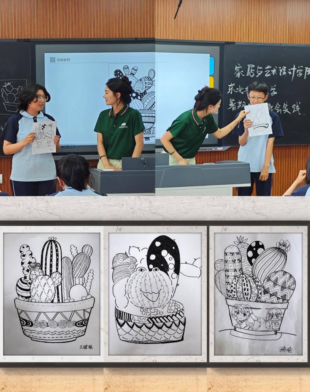 实践第一天,实践团队走进泰来第二中学,为当地同学们带来了一堂生动的线描画课程《神奇的仙人掌》。课堂上,团队成员们耐心细致地讲解了仙人掌的生长环境、结构形态,以及品格精神。引导学生通过观察和练习,掌握线条的运用和表现力。同学们跟随着老师们的讲解,逐步绘制出了富有创意和个性的绘画作品。课程丰富了同学们的学习生活,激发了同学们的想象力和创造力。