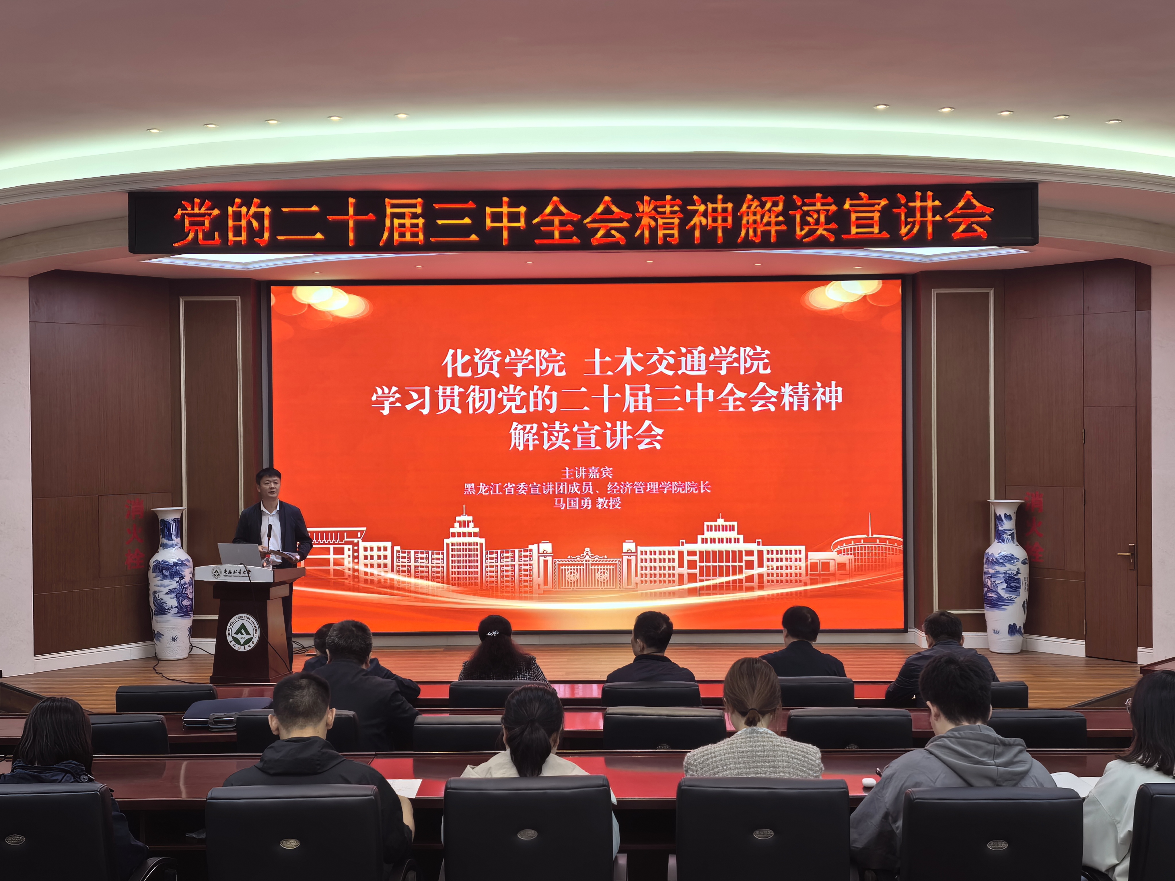 为深入学习领会党的二十届三中全会精神,教育引导师生自觉把思想和行动统一到全会精神上来,9月25日下午,土木与交通学院联合化学化工与资源利用学院,邀请黑龙江省委宣讲团成员、经济管理学院院长马国勇教授,为两院全体教师作宣讲报告。两院全体教师、党务工作者共计200余人参会学习。会议由化资学院党委书记蔡宇主持。