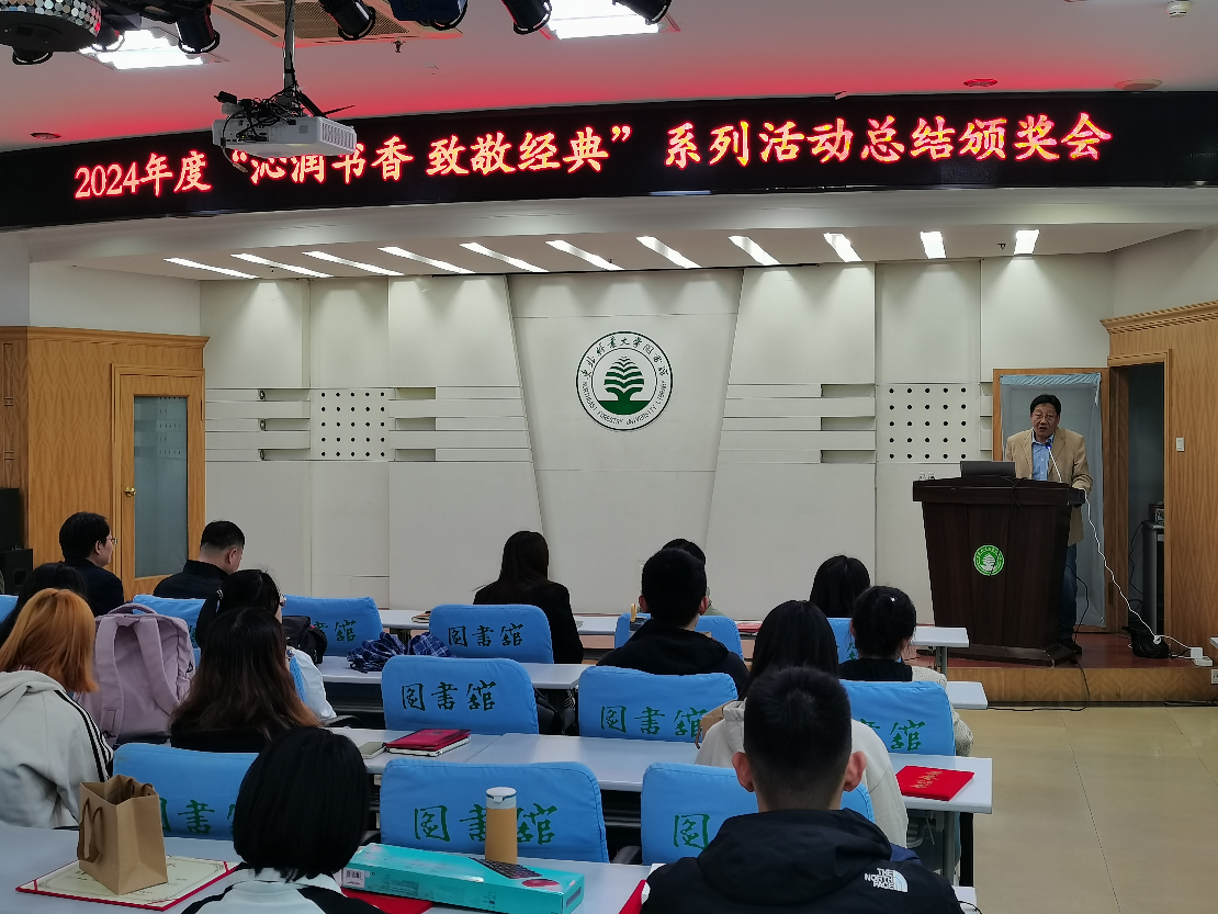 图书馆馆长张凤斌作总结讲话。他对获奖人员表示祝贺,对“沁润书香 致敬经典”主题系列活动的成功开展给予了充分肯定。他希望同学们多来图书馆,多读经典好书,多提宝贵建议,图书馆将竭诚为广大读者提供最优质的资源服务。
